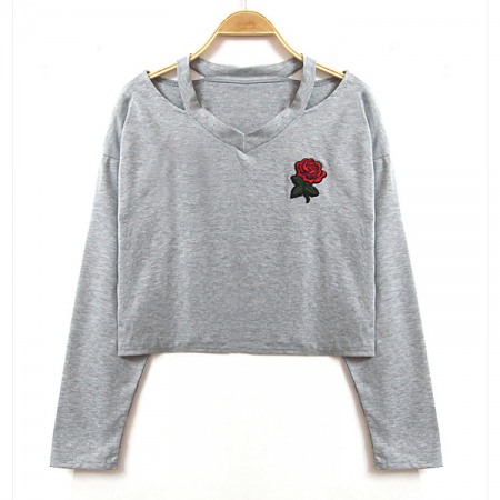 V-Neck Rose Embroidery Short Long-Sleeved T-Shirt
